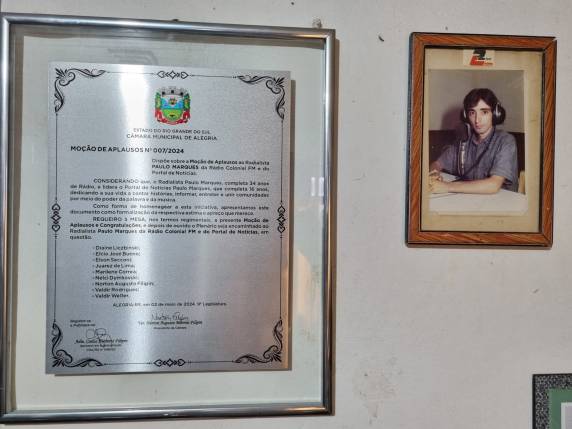 O Jornalista e Locutor de rádio, Paulo Marques, recebeu uma homenagem da Câmara Municipal de Alegria pelos 34 anos de atuação na Rádio Colonial FM de Três de Maio, e também pelos 16 anos do site Paulo Marques Notícias.