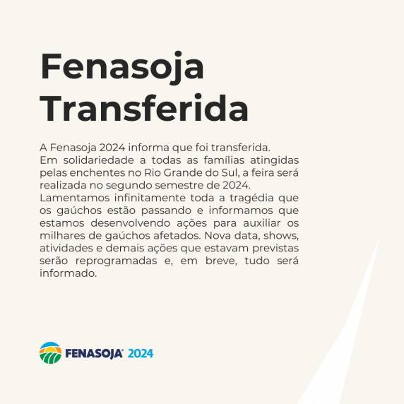 A Fenasoja 2024 informa que foi transferida. Em solidariedade a todas as famílias atingidas pelas enchentes no Rio Grande do Sul, a feira será realizada no segundo semestre de 2024.