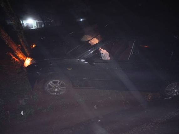 No local, proximo ao silo da empresa Cotricampo nas três pistas, um veículo de passeio cujo condutor ou condutora perdeu o controle da direção vindo a sair da pista e colidir em uma árvore.