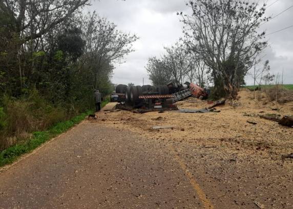 De acordo com as autoridades de segurança pública, no local um caminhão Bitrem carregado com soja acabou tombando na pista de rolamento.