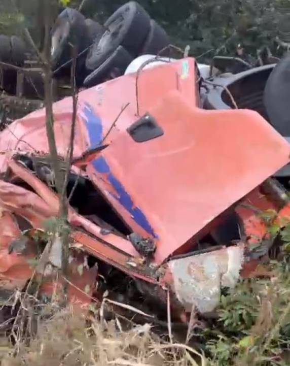 O caminhão ainda se encontra sobre a pista, quando é aguardada a chegada de uma equipe de seguro, e após a retirada do mesmo.