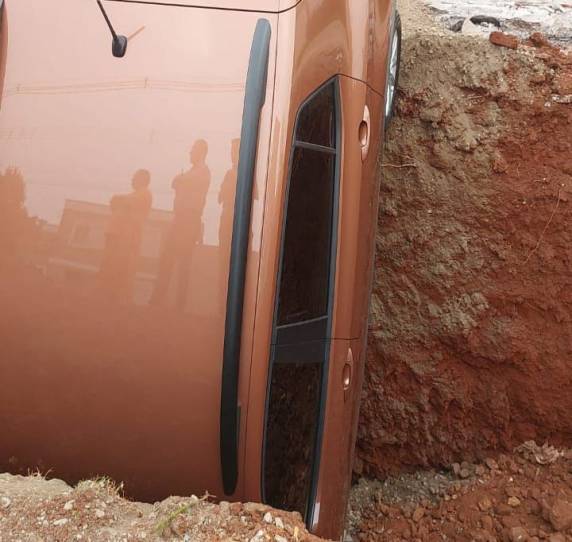 Uma motorista caiu com seu carro em uma vala ao deixar a garagem de seu prédio na manhã desta terça-feira (20). O caso ocorreu na Rua São José, no bairro Central, em Santa Rosa.