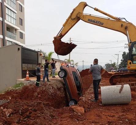 Uma retroescavadeira foi usada para tirar o carro do buraco. A obra da prefeitura de Santa Rosa está sendo executada por uma empresa terceirizada.