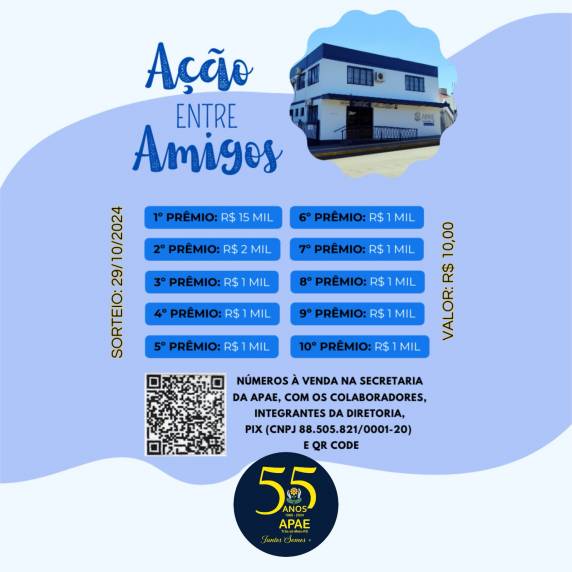 Cada cartela, com dois números, está sendo comercializada a R$ 10. Os números podem ser adquiridos na secretaria da Apae (Rua Santo Ângelo, 1370), com os colaboradores, integrantes da diretoria e pelo Pix (CNPJ 88.505.821/0001-20).