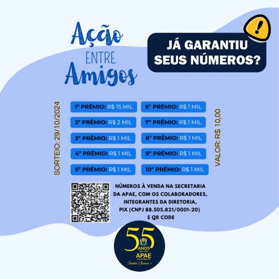 Restam poucos dias para adquirir os números da Ação Entre Amigos da Apae de Três de Maio. E você, já garantiu suas cartelas? A ação, conforme o presidente, Paulo Camargo, tem como objetivo angariar recursos para manutenção dos serviços oferecidos pela instituição.