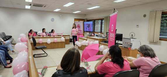 A Juíza Vanessa Teruya Bini Mendes, titular da 2ª Vara Judicial e Diretora do Foro, abriu o evento, destacando a relevância da prevenção, detecção precoce, os fatores de risco, além da importância da disseminação do conhecimento com ações voltadas para a educação em saúde. Em seguida, as voluntárias do Instituto Amigas da Mama de Três de Maio, Terezinha Zawatski e Beatriz Schwaab conduziram uma palestra esclarecedora sobre o tema e ensinaram como realizar o autoexame, proporcionando informações valiosas aos participantes.