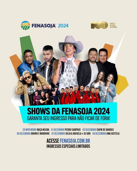 Segue a venda dos ingressos para os shows da Fenasoja 2024. A diferença desta edição é que mesmo pagando o ingresso de acesso ao parque, que custa R$10, o público que deseja assistir as atrações musicais na Arena deverá adquirir o acesso aos shows separadamente. Todas as entradas adquiridas para a edição de maio seguem válidas.