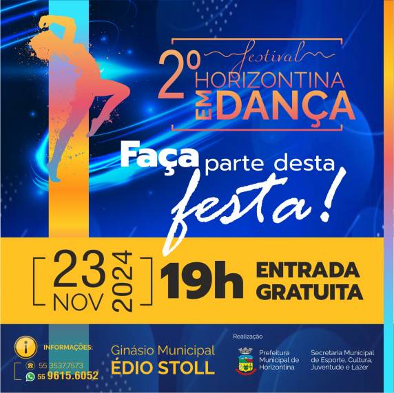 Será no sábado, dia 23, a partir das 19h, no Ginásio Édio Stoll. Entrada gratuita e mais de uma centena de bailarinos de Cias de Dança de vários municípios estarão presentes. Participe. Todos esses eventos sob a coordenação da Secretaria de Esporte, Cultura, Juventude e Lazer. Ingressos Livres. Venha Prestigiar!
