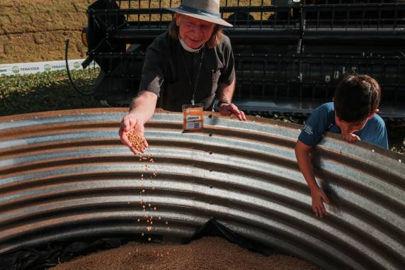 A celebração dos 100 anos da soja no Brasil seguiu neste sábado (30/04), na Fenasoja 2024, com o ato simbólico do plantio da soja no país, que mobilizou lideranças do setor agropecuário e imprensa junto à área da Exporural, em Santa Rosa, município que leva o título de Berço Nacional da Soja. Na oportunidade também foram apresentadas as estimativas da safra da soja no Rio Grande do Sul para o ano 2024/25.