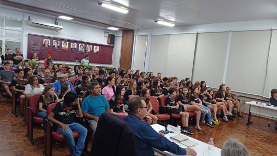 O corpo coreográfico, porta bandeiras, Mór, balizas, corpo musical e professora da banda, tiveram suas conquistas valorizadas pelos legisladores e o Secretário de Esporte Cultura e Lazer Valmir Lucas representou o Poder Executivo na solene homenagem.