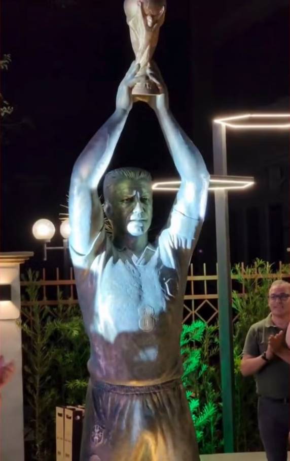 Escultura replica momento em que o ex-jogador de futebol levanta a taça da Copa do Mundo, em 1994. Peça tem 3 metros de altura e foi esculpida pelos artistas Iouri Petrov e André Ajambuja.