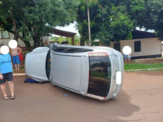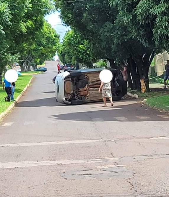 No local um veículo Ford Focus que transitava no sentido Bairro/Centro colidiu em uma árvore do passeio vindo a tombar na via.