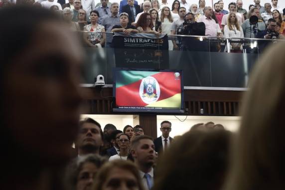 A TV da Assembleia se atrapalhou no início da sessão. Durante a execução do Hino Nacional pelo violinista Zelito Ramos, na abertura dos trabalhos, a transmissão exibiu pelo menos três vezes a bandeira do Rio Grande do Sul.