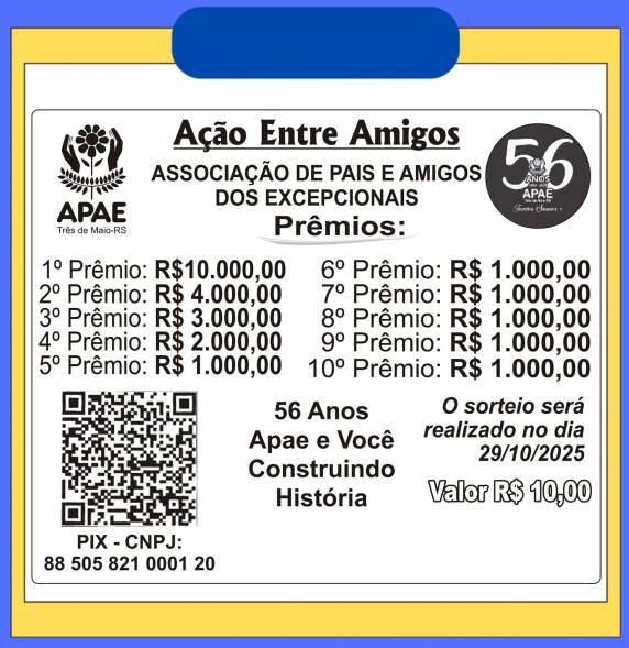 A Apae de Três de Maio iniciou a comercialização de números de Ação Entre Amigos. Serão sorteados R$ 25 mil em dinheiro, divididos em dez prêmios. O primeiro prêmio é R$ 10 mil, o segundo R$ 4 mil, o terceiro R$ 3 mil e o quarto prêmio R$ 2 mil. Do quinto ao décimo, o prêmio é R$ 1 mil cada.