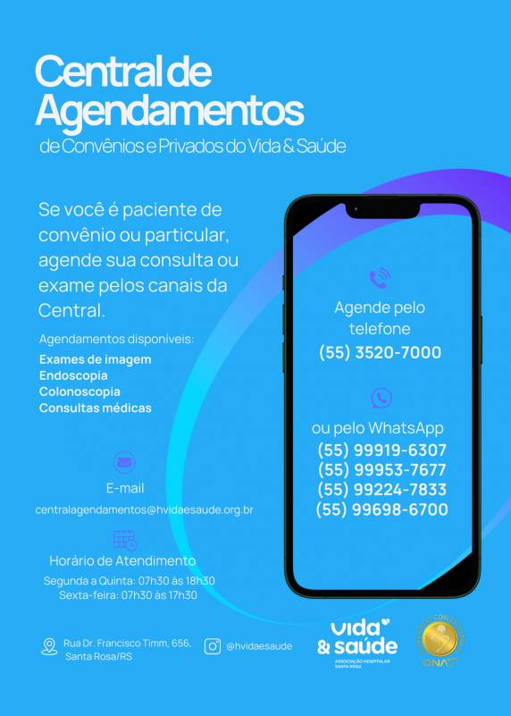 A partir de segunda, os agendamentos de pacientes de convênios e particulares poderão ser realizados pelo telefone (55) 3520-7000 ou pelo WhatsApp (55) 99919-6307, (55) 99953-7677, (55) 99224-7833 e (55) 99698-6700. A Central de Agendamentos funcionará de segunda a quinta-feira das 07h30 às 18h30 e nas sextas-feiras das 07h30 às 17h30, sem fechar ao meio-dia.