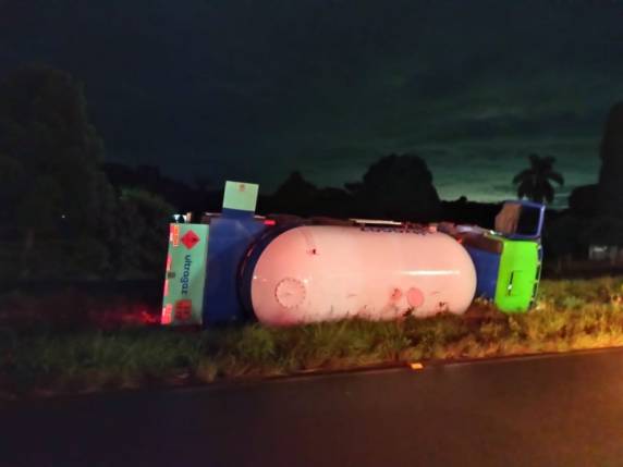 De acordo com informações obtidas pelo Repórter Policial da Rádio Uirapuru, um caminhão carregado com gás saiu da pista e tombou, provocando vazamento da carga no local.