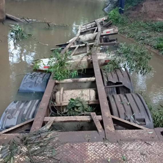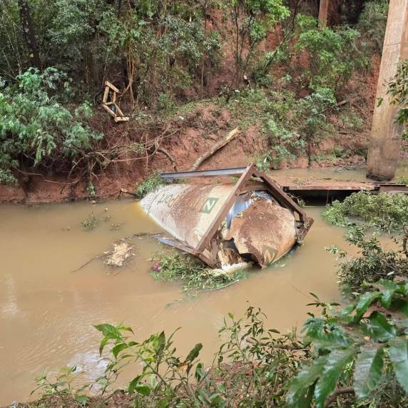 Durante o trajeto, a carreta acabou desengatando e caiu da ponte. Apesar do susto, o motorista não se feriu e a carga de glicerina não vazou.