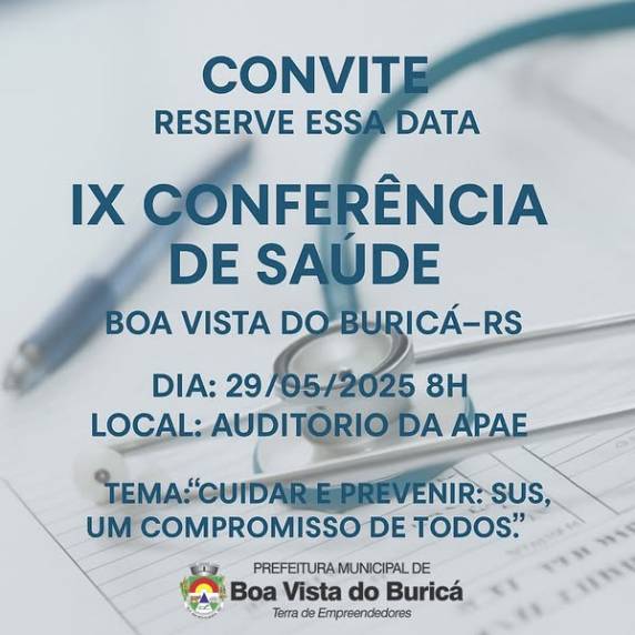 O Conselho Municipal de Saúde, em parceria com a Secretaria Municipal de Saúde de Boa Vista do Buricá, convida a comunidade para a 9ª Conferência Municipal de Saúde, que ocorrerá no dia 29 de maio de 2025, a partir das 8h, no Auditório da APAE.