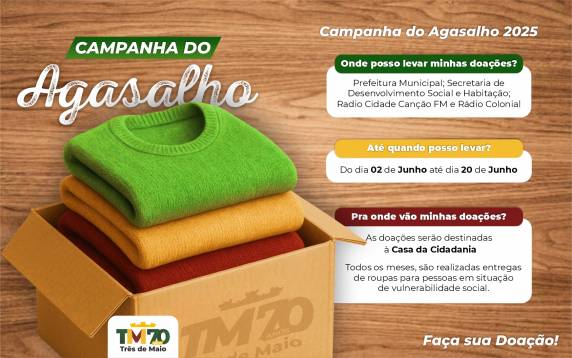O Governo Municipal de Três de Maio, por meio da Secretaria de Desenvolvimento Social e Habitação, convida toda a comunidade a participar da Campanha do Agasalho 2025. A iniciativa busca arrecadar roupas de frio, cobertores e calçados em bom estado, que serão destinadas a pessoas em situação de vulnerabilidade social.