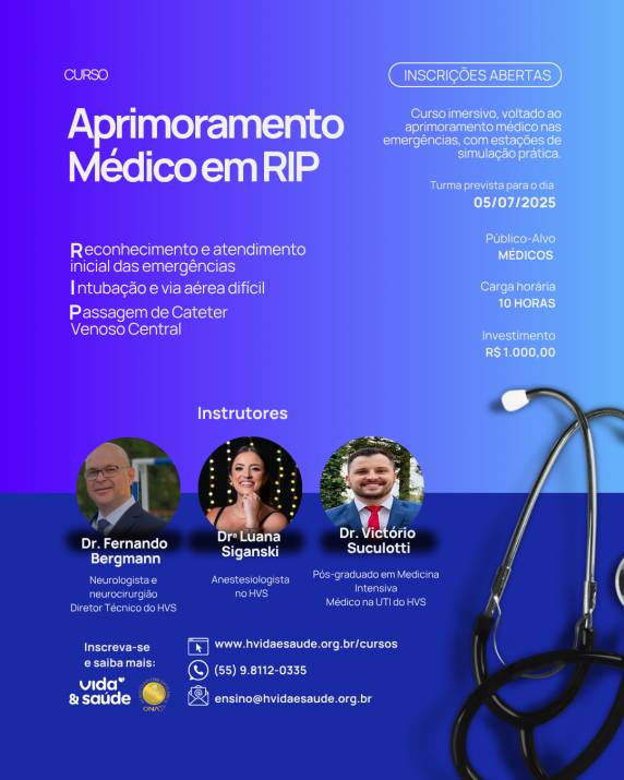 Dividido em três módulos, o curso aborda o Reconhecimento e atendimento iniciais das emergências; Intubação e via aérea difícil e Passagem de cateter venoso central. Com 10 horas de carga horária, com revisão teórica e estações de simulação, o curso está programado para o dia 05 de julho. Entre os instrutores estão profissionais altamente qualificados e atuantes no HVS, como o diretor técnico Dr. Fernando Bergmann, a anestesiologista Dra. Luana Siganski e o médico Victório Suculotti, plantonista da UTI Adulto.