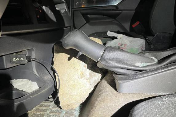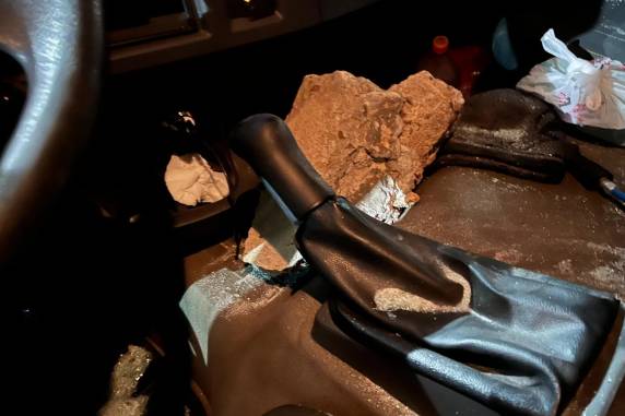 Embora a Polícia Civil ainda não tenha confirmado oficialmente o tamanho da pedra que quebrou o para-brisa do caminhão, imagens registradas no local mostram um pedaço de aproximadamente 20 centímetros de largura.