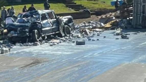 Imagens que circulam nas redes sociais mostram o momento em que a carreta perde o controle ao contornar a curva. A carga transportada invade a pista contrária e o veículo acaba tombando sobre a rodovia. Na sequência, outros dois veículos que trafegavam no sentido oposto acabam se envolvendo no acidente.
