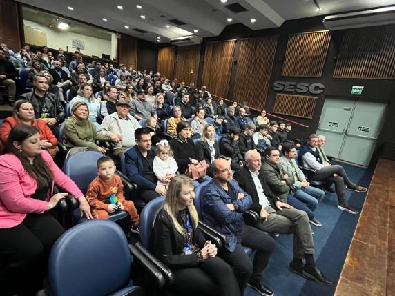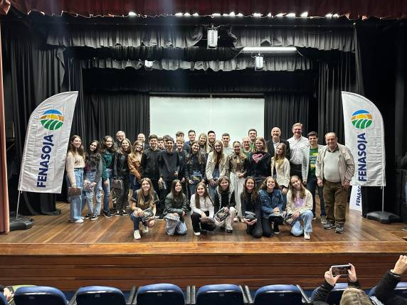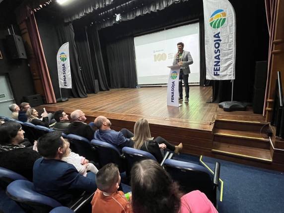 A história do principal grão produzido no país recebeu ênfase, mais uma vez, com o lançamento do documentário cultural 100 anos da Soja no Brasil, apresentado pelo Sesi Show. O ato realizado nesta quarta-feira (09/07), reuniu lideranças, imprensa e a comunidade no auditório do Sesc, em Santa Rosa. O centenário da chegada dos primeiros grãos tem sido celebrado em diversas ações apoiadas pela Fenasoja desde 2024.