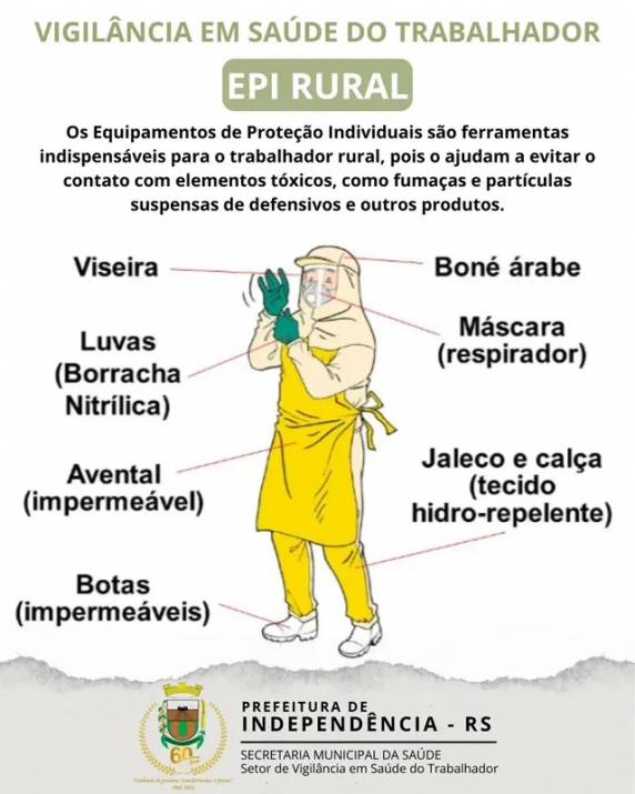 A Secretaria Municipal da Saúde de Independência, por meio do Setor de Vigilância em Saúde do Trabalhador, reforça a importância do uso de Equipamentos de Proteção Individual (EPIs) pelos trabalhadores rurais. Os EPIs são fundamentais para prevenir o contato direto com substâncias tóxicas, como partículas de defensivos agrícolas, fumaças e outros agentes nocivos à saúde.