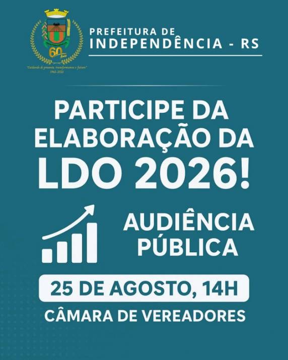 A Prefeitura Municipal de Independência convida a comunidade para participar da audiência pública de elaboração da Lei de Diretrizes Orçamentárias (LDO) 2026. O encontro acontecerá no dia 25 de agosto, às 14h, na Câmara Municipal de Vereadores.