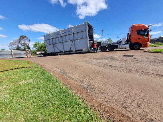 Na tarde desta terça-feira (09), por volta das 14h20min, uma carreta prancha que transportava um equipamento de 27 toneladas ficou imobilizada ao passar por uma lombada física no trevo da Picapau, na RS-342, em Três de Maio.