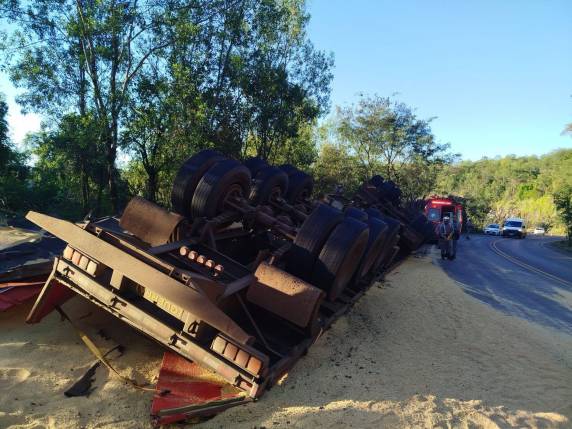 O caminhão está tombado na lateral da via e o Corpo de Bombeiros Militar trabalha para desencarcerar o condutor da carreta das ferragens.