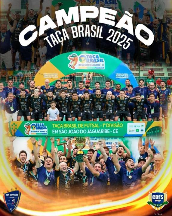 A SER Santiago escreveu uma página histórica no futsal brasileiro nesta segunda-feira (22), ao vencer o Fortaleza por 6 a 4 e conquistar a Taça Brasil – 1ª Divisão, em São João do Jaguaribe, no Ceará. O título, inédito para o clube, garante vaga na Divisão Especial da competição em 2026.
