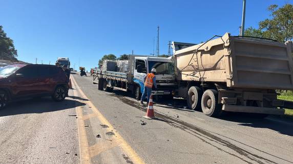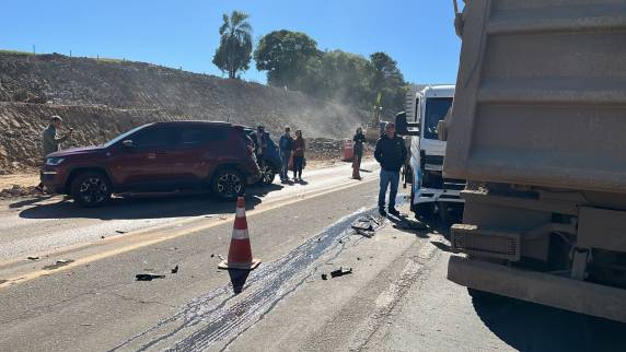 Segundo informações de ouvintes, a colisão envolveu uma T-Cross, um Jeep Compass, um caminhão Mercedes-Benz de empresa terceirizada e um caminhão Volkswagen 11.180.