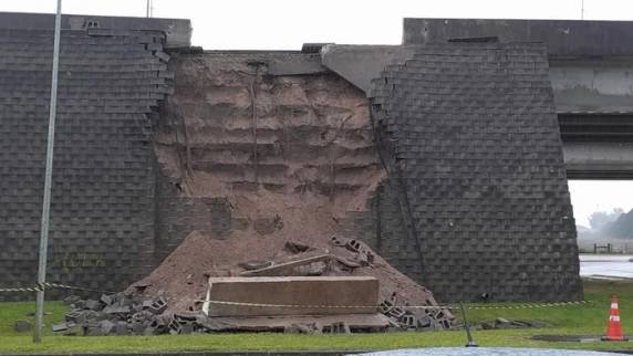 Em Pelotas, na Região Sul, a parte lateral do muro de contenção de um viaduto da BR-116 desmoronou durante a tarde. A estrutura cedeu no km 514 e um desvio foi feito pela marginal da via.