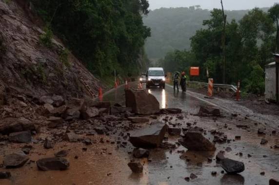 Na BR-470, o trecho que está em obras, entre Bento Gonçalves e Veranópolis, teve o trânsito interrompido devido ao risco de movimentação de solo e desprendimento de pequenos blocos de rocha.