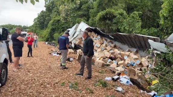 Com o impacto, a carga de serragem transportada por um dos caminhões espalhou-se sobre a rodovia. O trânsito flui em meia pista, no sistema Pare e Siga.