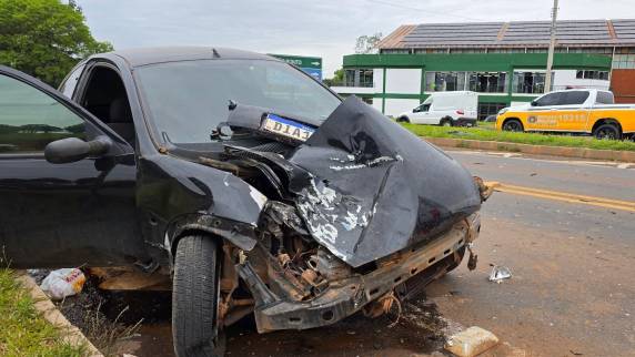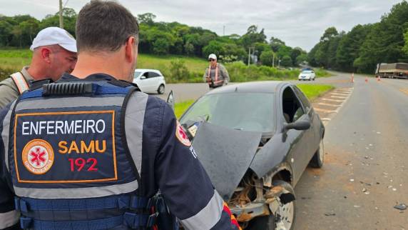 Condutor de um Ford Ka colidiu na traseira de um caminhão e foi encaminhado ao Hospital São Vicente de Paulo; veículo teve perda total e o caminhão não foi localizado.