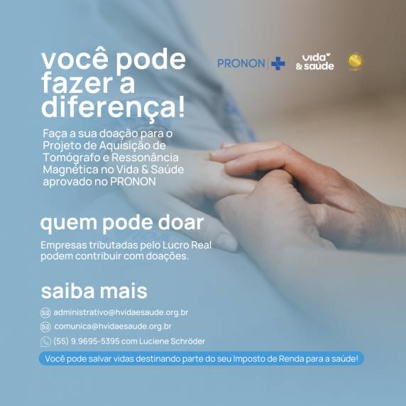 Interessados em colaborar com a viabilização do projeto podem entrar em contato pelos e-mails administrativo@hvidaesaude.org.br e comunica@hvidaesaude.org.br ou pelo telefone (55) 9.9695-5395 com Luciene Schröder.