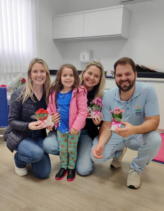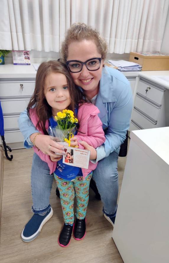 Acompanhada da mãe, Manu veio para seu último atendimento na reabilitação intelectual e aproveitou para entregar um cartão e uma flor como forma de agradecimento pelo cuidado recebido nos últimos quatro anos. O gesto foi direcionado à assistente social Fabiane Freoder, à terapeuta ocupacional Daniela Behnen, à fonoaudióloga Iasmim Kasprczak, à psicóloga Carina Mayer Mirowski e ao fisioterapeuta Jefferson Kettner Winterfeld.