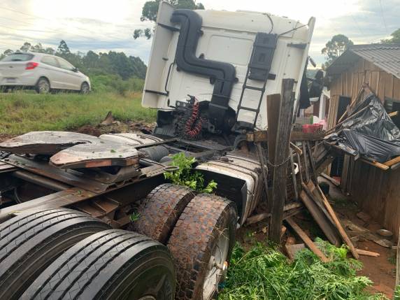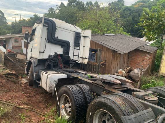 Ao tentar evitar o acidente, o caminhão acabou saindo da pista e tombando às margens da via, em uma área com diversas residências. Com o impacto, o veículo atingiu o portão de entrada de uma casa, parando a poucos metros da porta principal do imóvel.