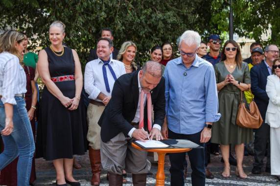 O Ministério Público do Rio Grande do Sul (MPRS) e o Movimento Tradicionalista Gaúcho (MTG) assinaram, nesta sexta-feira, 6 de março, na Praça da Matriz, em frente ao Palácio do MP, o termo de cooperação que institui o projeto “Entre Laços”, uma parceria destinada ao desenvolvimento de ações integradas de prevenção, conscientização, acolhimento e enfrentamento à violência contra a mulher no ambiente dos CTGs e demais espaços do tradicionalismo.
