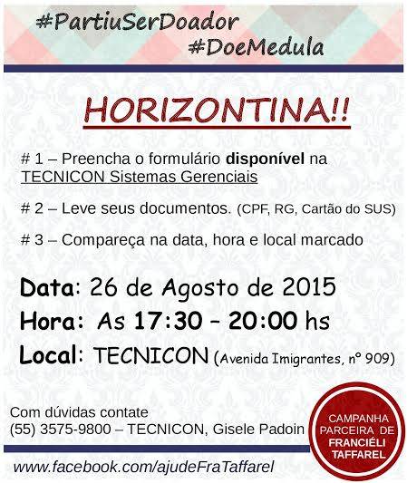Os colegas trabalho da empresa Tecnicon de Horizontina, estão mobilizados para ajuda-la, e fazem ampla divulgação de duas campanhas com coletas de sangue que serão feitas pelo Emocentro de Santa Rosa.