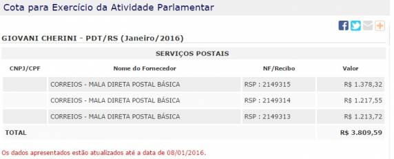 serviços postais é Giovani Cherini (PDT-RS). Em oito dias, ele gastou nada menos do que R$ 3.809,59. São três notas fiscais apresentadas, com valores de R$