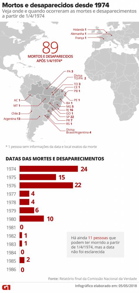 De acordo com o levantamento do G1, além dos 89 casos confirmados, há outras 11 pessoas que podem ter morrido ou desaparecido a partir de 1º de abril de 1974 – a