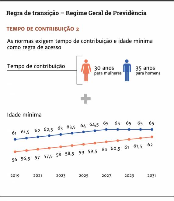 A segunda possibilidade observa tempo de contribuição e idade mínima. Pela proposta do governo federal, homens só poderão se aposentar com 65 anos e, mulheres, com 62 anos, após este período de transição. Para os homens, esta janela de tempo vai durar oito anos, começando com idade de 61 anos. Para as mulheres, o período de transição é de 12 anos, começando com a idade de 56 anos.