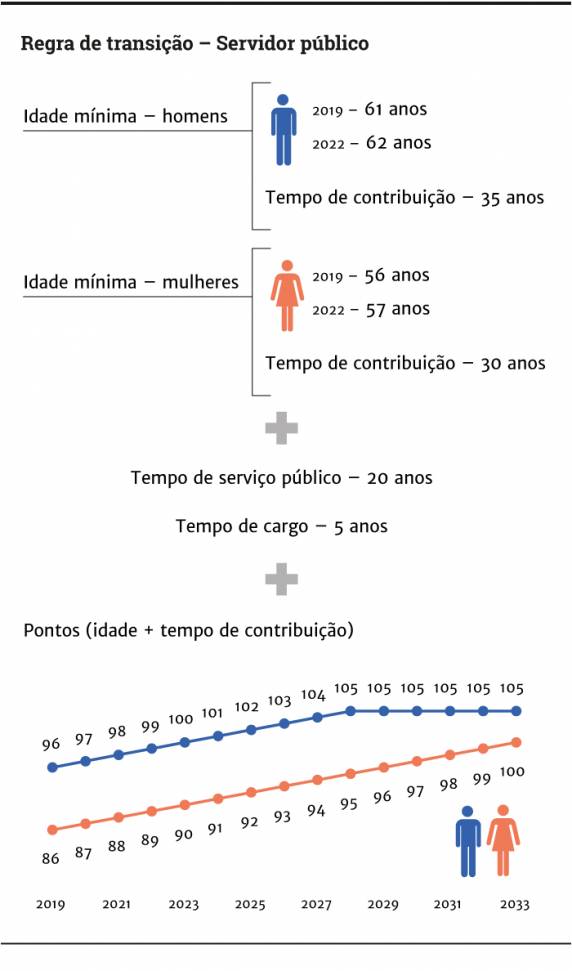 A primeira alternativa leva em consideração o tempo de contribuição e a idade. A fórmula é parecida com a regra atual para requerer a aposentadoria integral, pela regra 86/96 — que prevê soma de 86 anos dos dois fatores para mulheres e 96 para homens, respeitando o mínimo de 35 anos de contribuições para trabalhadores do sexo masculino e 30 para o feminino. Esta possibilidade de transição prevê acréscimo de um ponto percentual por ano, até chegar, em 2028, a 105 pontos para homens e, em 2033, a 100 pontos.
