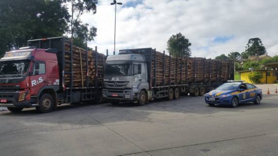 Policiais rodoviários federais flagraram hoje de manhã, na BR 116, em Mafra, dois caminhões do Paraná transportando toras de madeira, vindo de Santa Cecília/SC com destino à cidade de Araucária/PR.