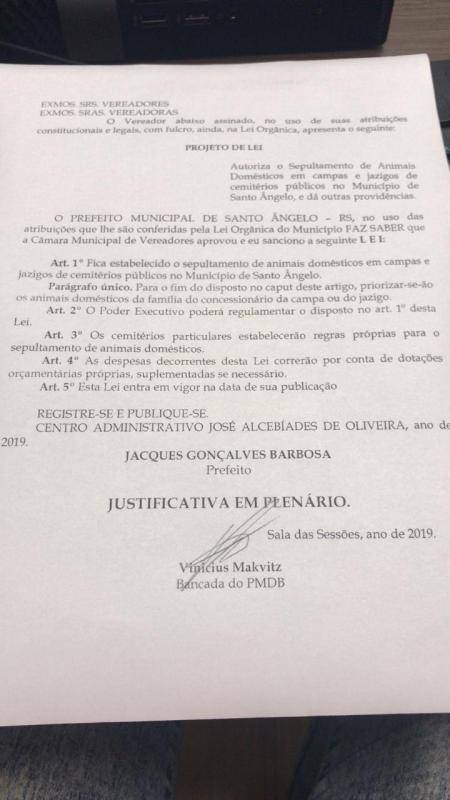 Pelo projeto fica estabelecido o sepultamento de animais domésticos em campos e jazigos em cemitérios públicos de Santo Ângelo.