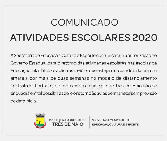 A Secretaria de Educação, Cultura e Esporte comunica que a autorização do Governo Estadual para o retorno das atividades escolares nas escolas da Educação Infantil só se aplica às regiões que estejam na bandeira laranja ou amarela por mais de duas semanas no modelo de distanciamento controlado. Portanto, no momento o município de Três de Maio não se enquadra em tal possibilidade, e o retorno às aulas permanece sem previsão de data inicial.