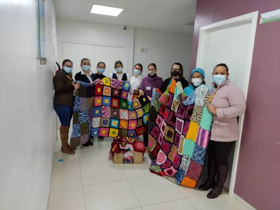 “É com muito carinho e gratidão que recebemos a doação das mantas confeccionadas em um projeto tão especial. As mantas estarão à disposição de nossos pacientes que realizam tratamento de quimioterapia na Instituição, como forma de acolhimento e humanização durante o tratamento”, destaca a enfermeira Kamila Lehr, coordenadora da Oncologia do Hospital Vida & Saúde.